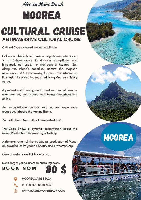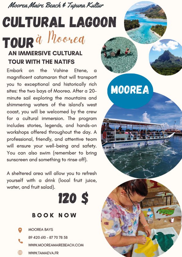 will transport you over clear waters Through the two bays of Moorea, then you will be welcomed by the crew for a unique cultural immersion.